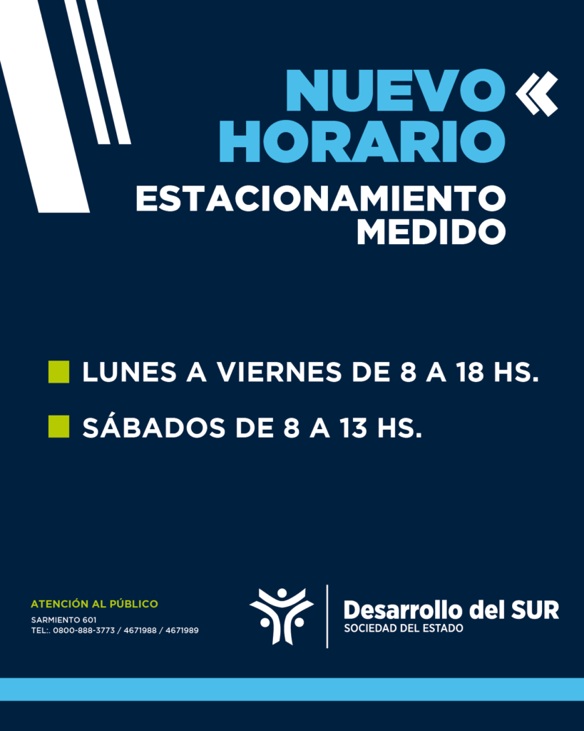 Desarrollo del Sur (Sociedad del Estado) informa que a partir del lunes 22 de junio se modificará el horario de cobro del estacionamiento medido en el micro y macrocentro de la ciudad. Para mantener la consonancia con el nuevo horario habilitado de las actividades comerciales y de servicios, el cobro del estacionamiento medido se realizará de lunes a viernes entre las 8 y las 18 hs., y los sábados de 8 a 13 hs.