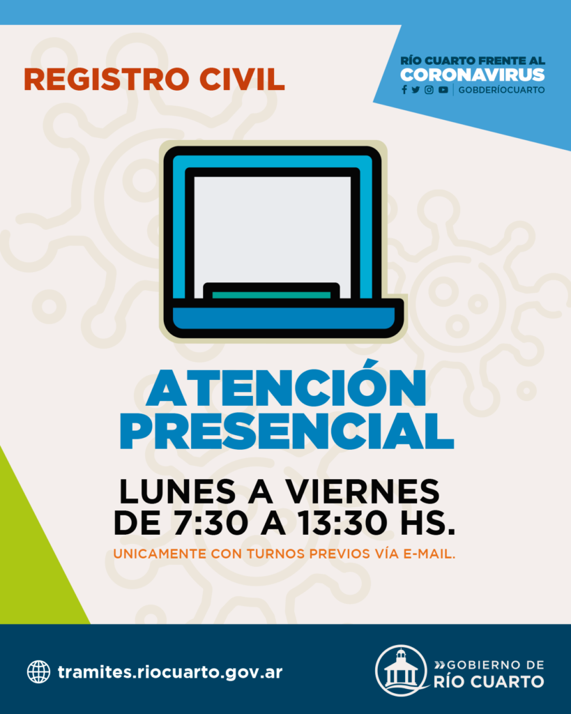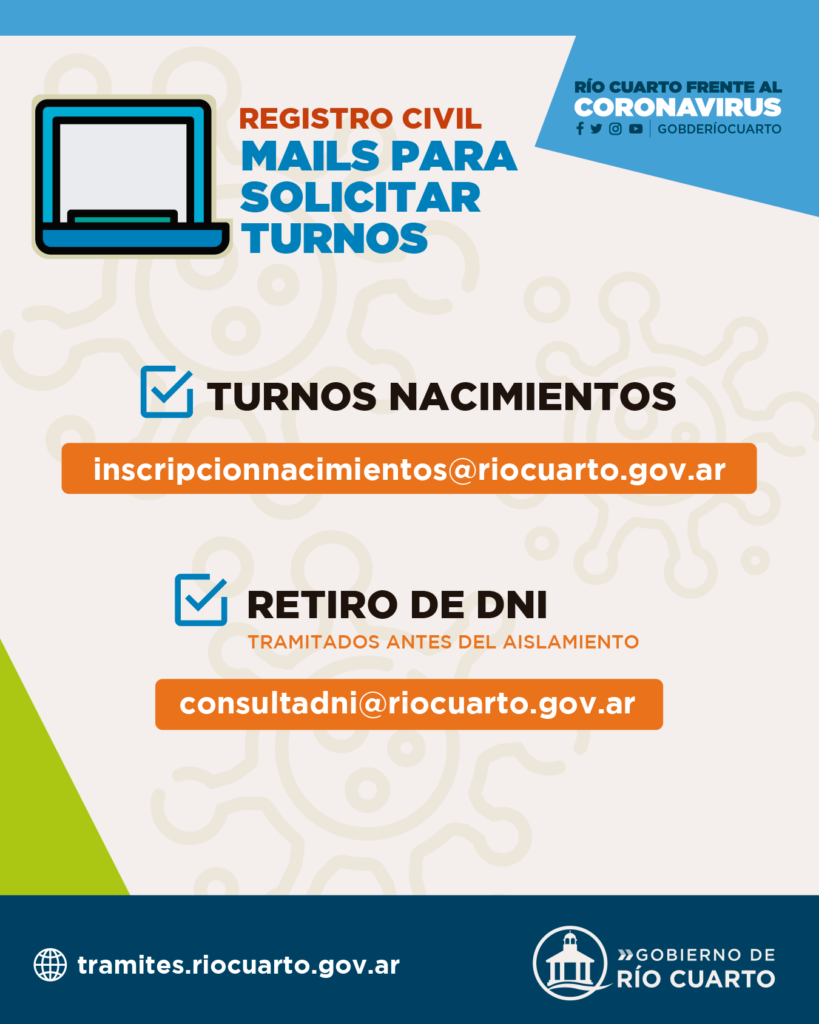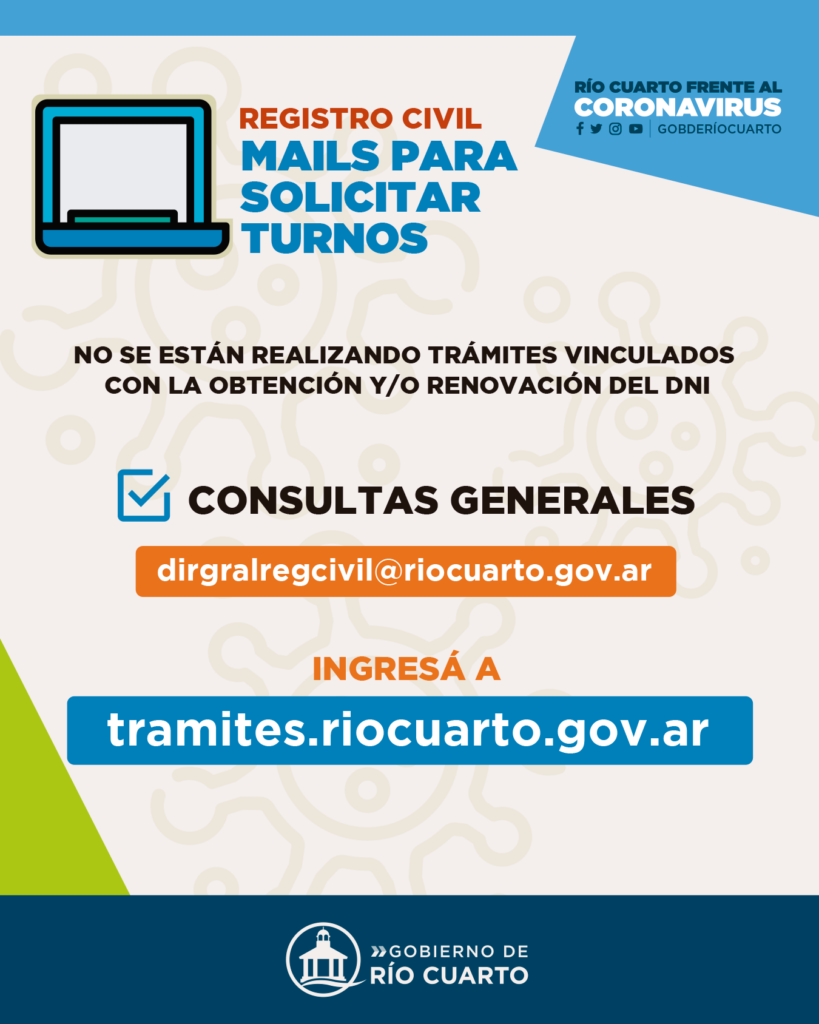 Asimismo, se aclara que la atención por defunciones se realiza en el mismo horario, y que actualmente NO SE ESTÁN REALIZANDO trámites vinculados con la obtención y/o renovación del DNI. Para otras consultas generales se puede utilizar el mail dirgralregcivil@riocuarto.gov.ar.