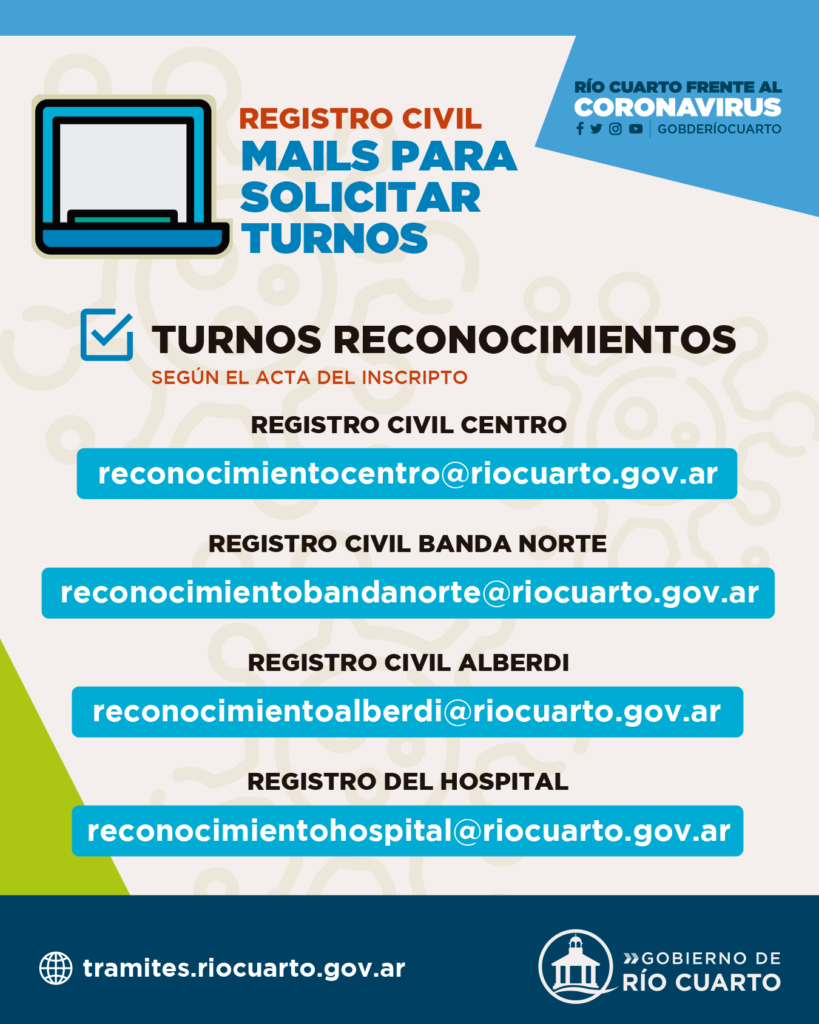 – Inscripción de Reconocimientos: reconocimientocentro@riocuarto.gov.ar; reconocimientobandanorte@riocuarto.gov.ar; reconocimientoalberdi@riocuarto.gov.ar; reconocimientohospital@riocuarto.gov.ar (según donde este el acta del inscripto)