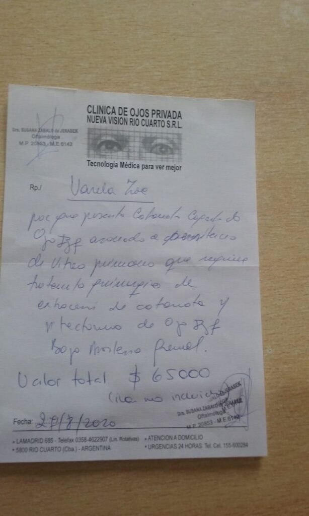 La Cirugía se realizaría en Rio Cuarto, su costo es de $ 65000, por lo cual la Familia a comenzado a realizar la venta de números de una Rifa para recaudar algo de dinero, pero necesita de la colaboración de la ciudad de Rio Cuarto.