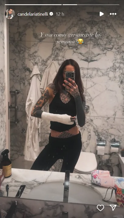A través de sus historias de Instagram, Cande publicó una foto de su mano vendada e ironizó con lo sucedido: “Y vos como arrancaste la semana?”.