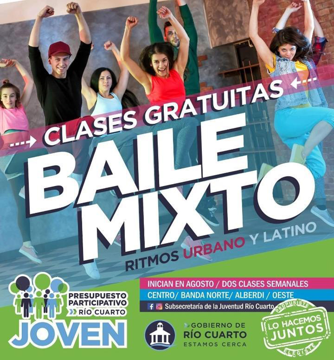 En el marco del Presupuesto Participativo Joven, en agosto inician las clases gratuitas de Baile Mixto. Se trata de una iniciativa mediante la cual se brindarán dos clases semanales de ritmos urbanos y latinos durante los meses de agosto, septiembre y octubre.