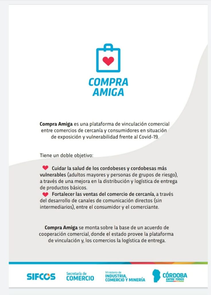 Al respecto,el Secretario de Comercio del Gobierno de la Provincia de Córdoba, Juan Pablo Inglese, expresó: “La idea fue crear una plataforma que pudiera vincular las necesidades de los cordobeses. Cuidar la salud es la prioridad cero, pero también buscamos cuidar a nuestros comercios. Por eso creamos Compra Amiga, para vincular consumidores y comerciantes, en una plataforma fácil de usar y muy amigable”.