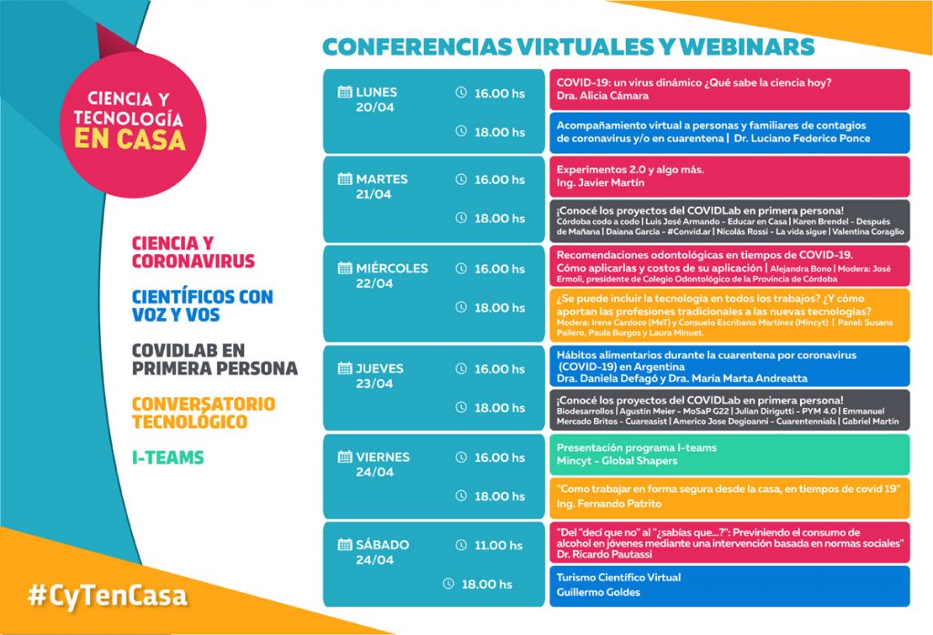 El ciclo de Ciencia y Tecnología en Casa comenzó con “Científicos con Voz y Vos”, con conferencias virtuales destinado a acercar conocimientos y temas de interés. A estas conferencias interactivas se sumaron las webinar para conocer los proyectos más destacados en el COVIDLab Córdoba («CovidLab en primera persona»). Así, los propios realizadores de los proyectos más destacados presentan las soluciones en ciencia, tecnología e innovación que idearon es este laboratorio virtual llevado adelante por el ministerio de Ciencia y Tecnología.
