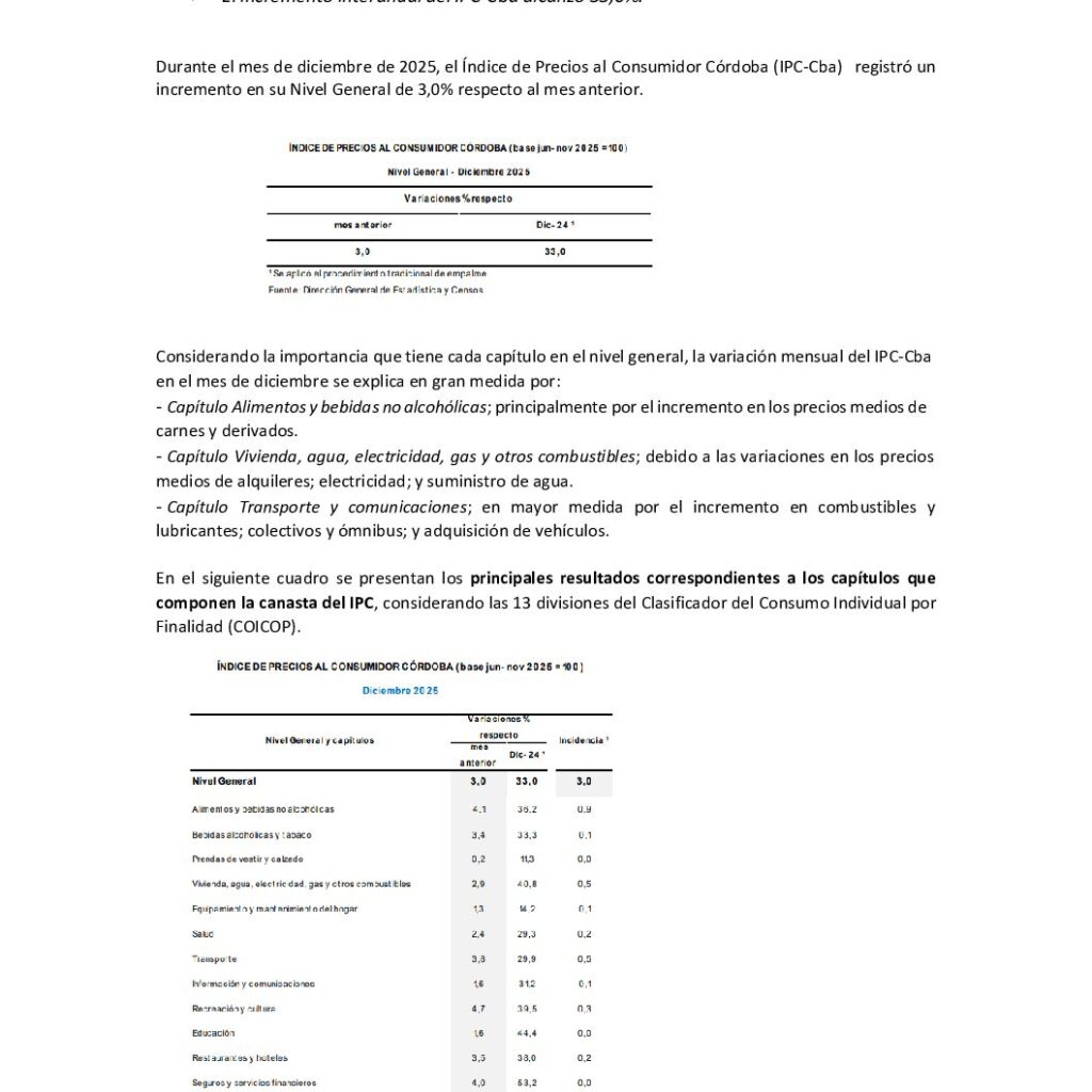 Durante el mes de diciembre de 2025, el Índice de Precios al Consumidor Córdoba (IPC-Cba) registró un incremento en su Nivel General de 3,0% respecto al mes anterior.