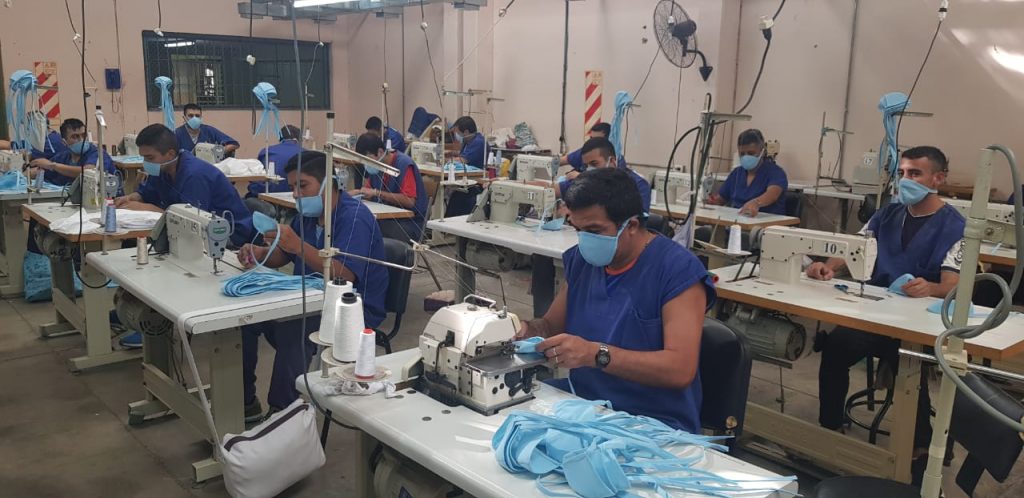 Se confeccionaron cerca de 14 mil barbijos. Personal y personas privadas de libertad confeccionan barbijos, ambos y kits de Bío seguridad. En la época de máxima producción hicieron 500 barbijos por día, hoy están realizando 300 y le sumaron frazadas y sábanas para los centros de internación.