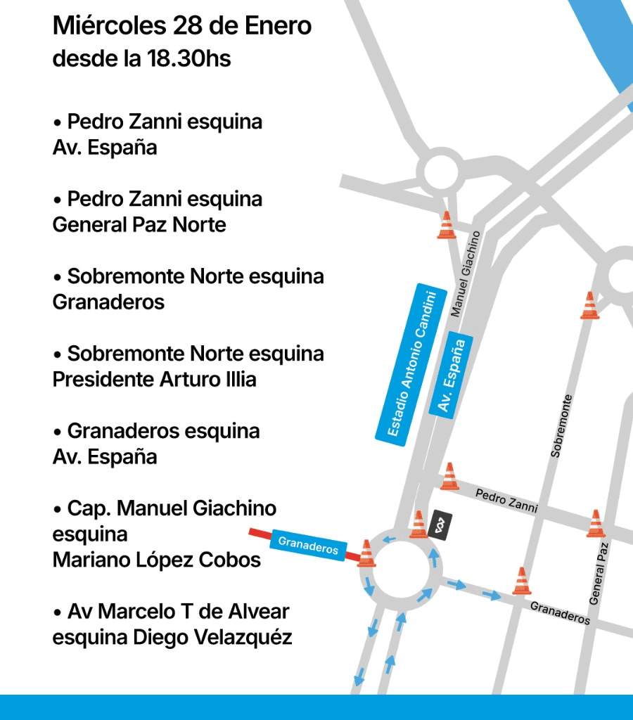 Con motivo del partido de fútbol que disputarán esta noche desde las 21:30 horas entre Estudiantes de Río Cuarto y Argentinos Juniors, se ha definido un esquema de cortes al tránsito vehicular, en el marco del operativo de seguridad definido por las autoridades competentes.