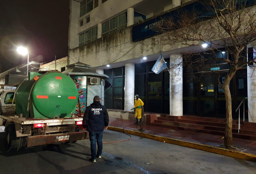 Personal de Defensa Civil, del Ente Preventivo Urbano (EPU), y Bomberos Voluntarios continúan con los operativos diarios de desinfección en los espacios de gran concurrencia de personas, como supermercados, farmacias, bancos, cajeros automáticos, clínicas y dispensarios, entre otros.