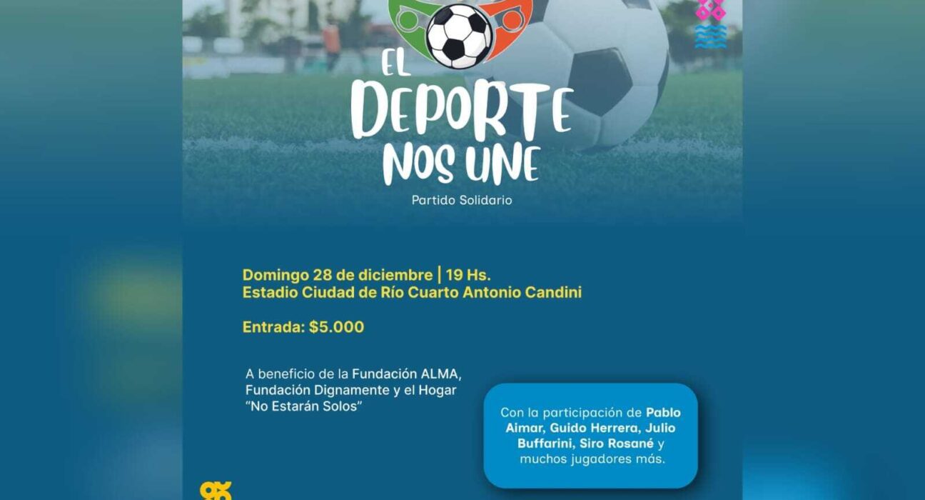 El próximo domingo 28 de diciembre se realizará el “El Deporte Nos Une”, un partido de fútbol solidario a beneficio de la Fundación ALMA, Fundación Dignamente y el Hogar No Estarán Solos. El evento contará con la participación del integrante del cuerpo técnico de la Selección Nacional Pablo Aimar, además de consagrados deportistas nacionales y provinciales. Será desde las 19 hs. en el Estadio Ciudad de Río Cuarto Antonio Candini del Club Estudiantes.