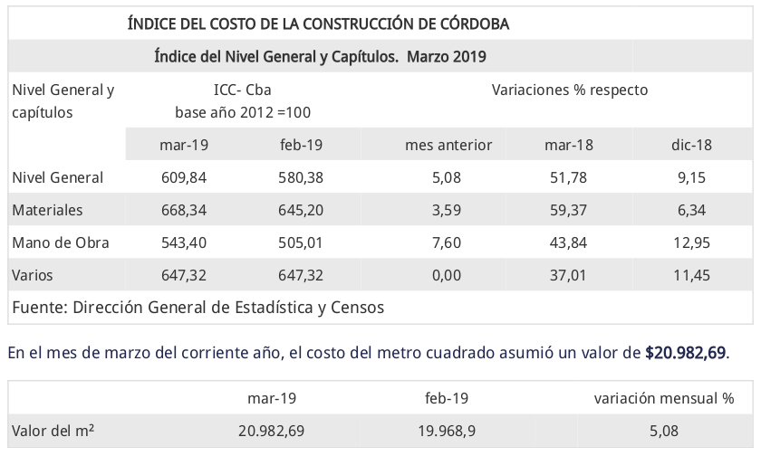Durante el mes de marzo de 2019, el Índice del Costo de la Construcción de Córdoba (ICC- Cba) registró una variación mensual del 5,08 % en su Nivel General, y del 51,78%, en relación a marzo 2018.