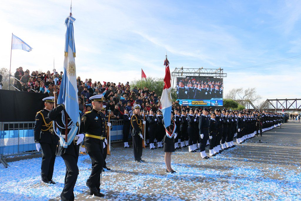 Frente a los niños de los colegios; “Leopoldo Lugones”, “República del Uruguay”, “10 de Junio”, “Tte. Gral. Julio Argentino Roca”, “21 de Julio”, “Gral. San Martín”, “Almirante Guillermo Brown, Mariano Moreno, “Florentino Ameghino”, “Hebe San Martín de Duprat”, “Mercedes del Niño Jesús” y “Santos Ángeles Custodios”, Schiaretti proclamó: “Prometen defenderla, respetarla y amarla, estudiando con firme voluntad, comprometiéndose a ser ciudadanos libres y justos, aceptando solidariamente en sus diferencias a todos los que pueblan nuestro suelo y asumiendo en todos sus actos los valores a los que representa nuestra Bandera”.