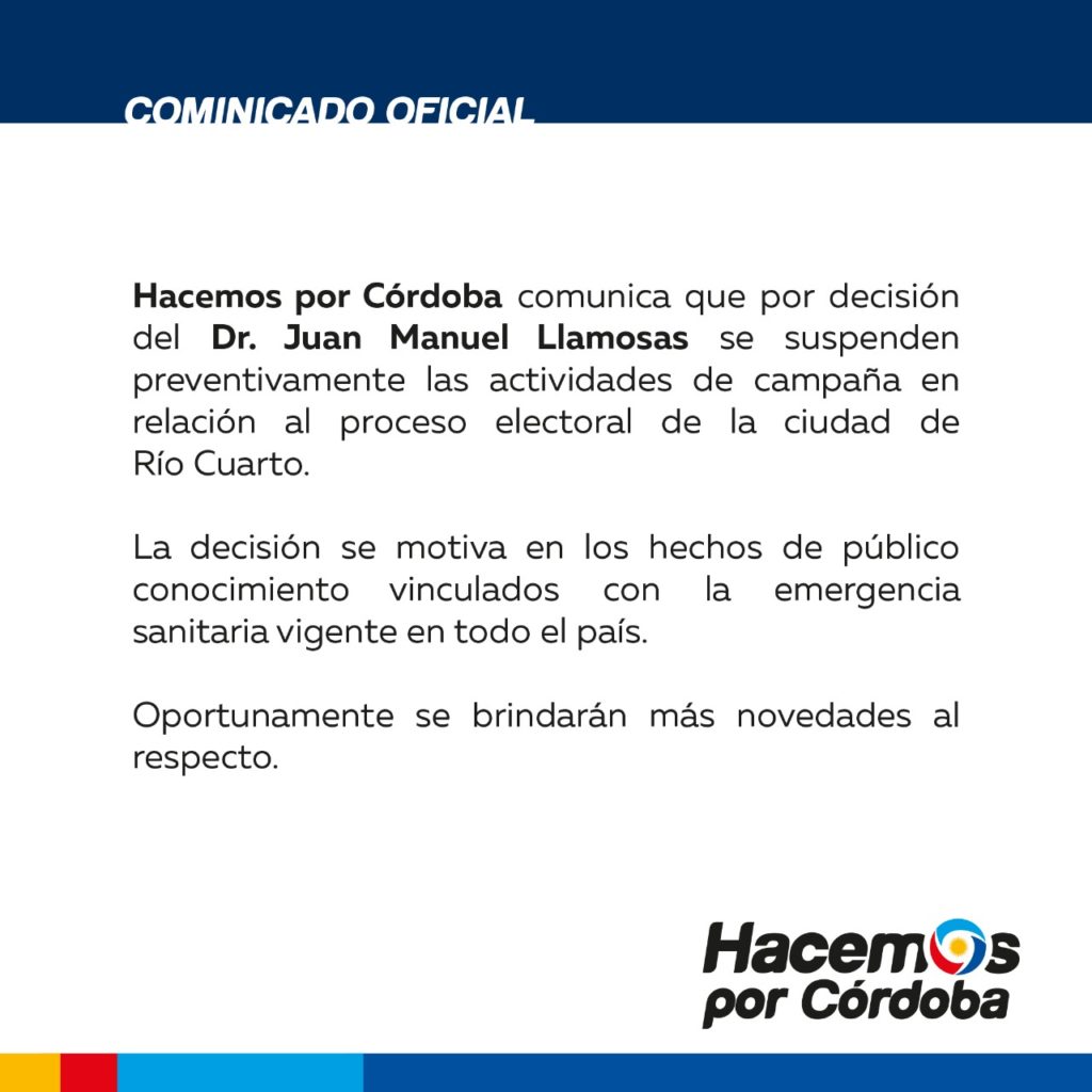 Locales Noticias Hacemos Por Cordoba suspende Actividades de Campaña 12 de marzo de 2020 La desicion fue tomada por Juan Manuel Llamosas