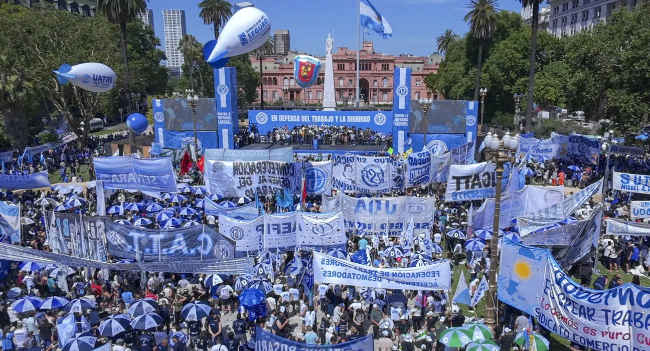 La CGT, las dos CTA, la UTEP y organizaciones sociales se movilizaron este jueves a Plaza de Mayo contra la reforma laboral que impulsa el gobierno de Javier Milei y anticipó que la medida fue el primer paso de un “plan de lucha” que culminará en un “paro nacional”.