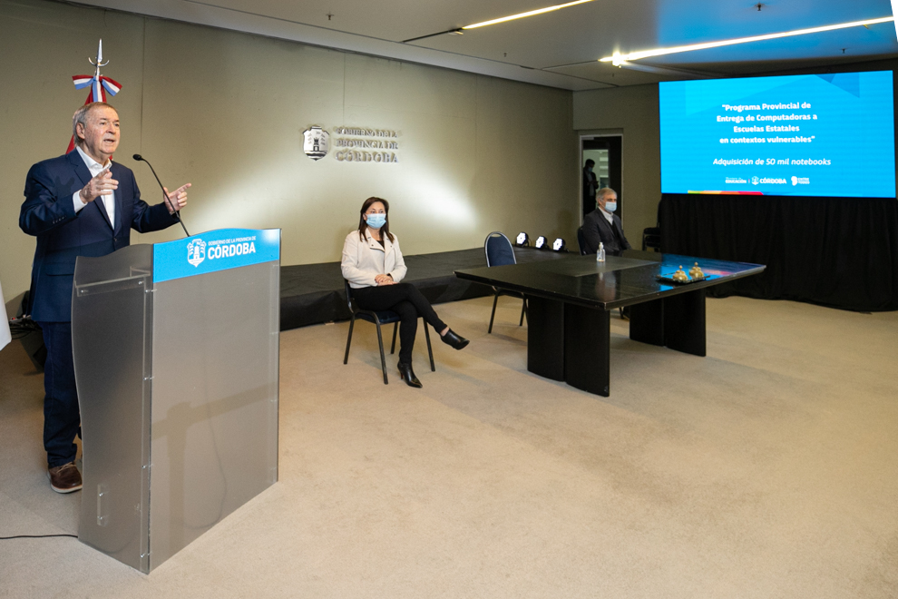 El gobernador Juan Schiaretti anunció este miércoles la compra de las primeras 20 mil notebooks con acceso a Internet a través de modem inalámbrico 4G, en el marco del “Programa provincial de entrega de computadoras a escuelas estatales en contextos vulnerables”, que beneficiará a más de 60 mil estudiantes de instituciones educativas provinciales.