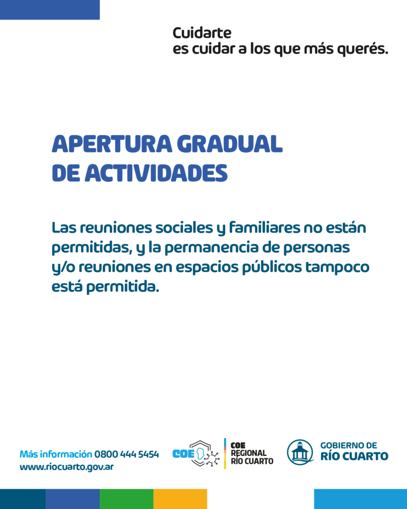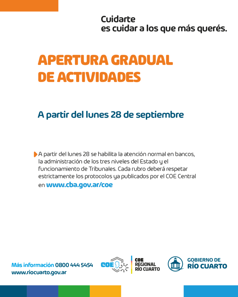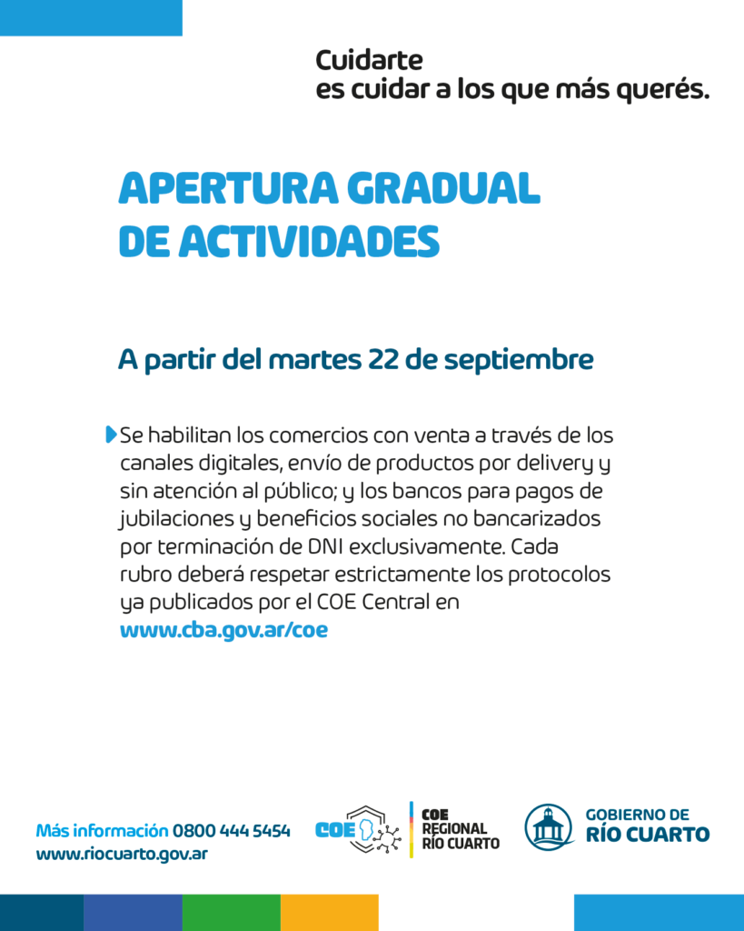 Asimismo, Llamosas aseguró que “es necesario generar el menor impacto posible en el sector productivo y empresarial de la ciudad”. “Por ello propongo un nuevo pacto social con derechos y obligaciones: el derecho de poder realizar más actividades desde el día sábado, pero también la obligación de cumplir estrictamente los protocolos que son necesarios para seguir cuidándonos entre todos”, expresó. “Les pido que sigamos por este camino. Río Cuarto se va a reponer de esta situación, pero para ello necesitamos estar más unidos que nunca”, afirmó.