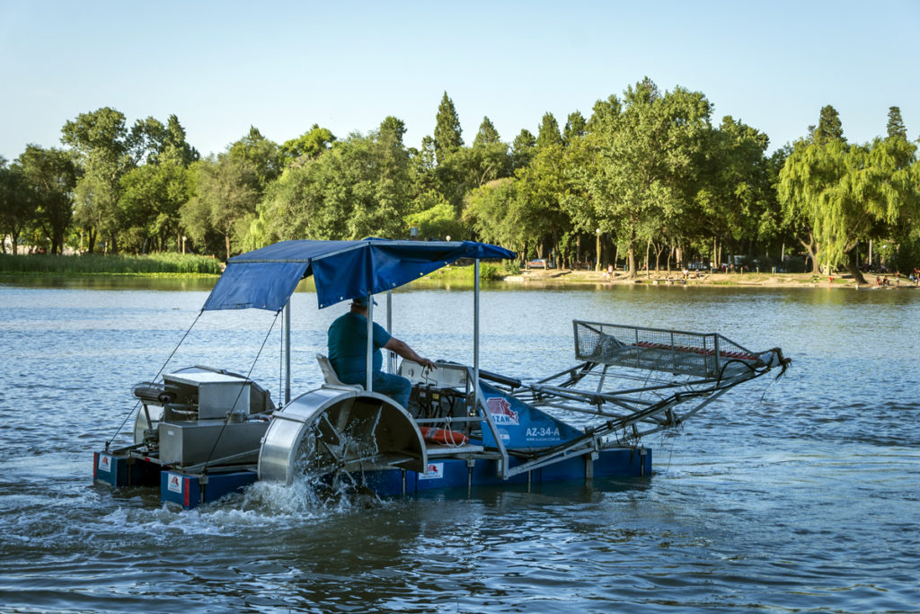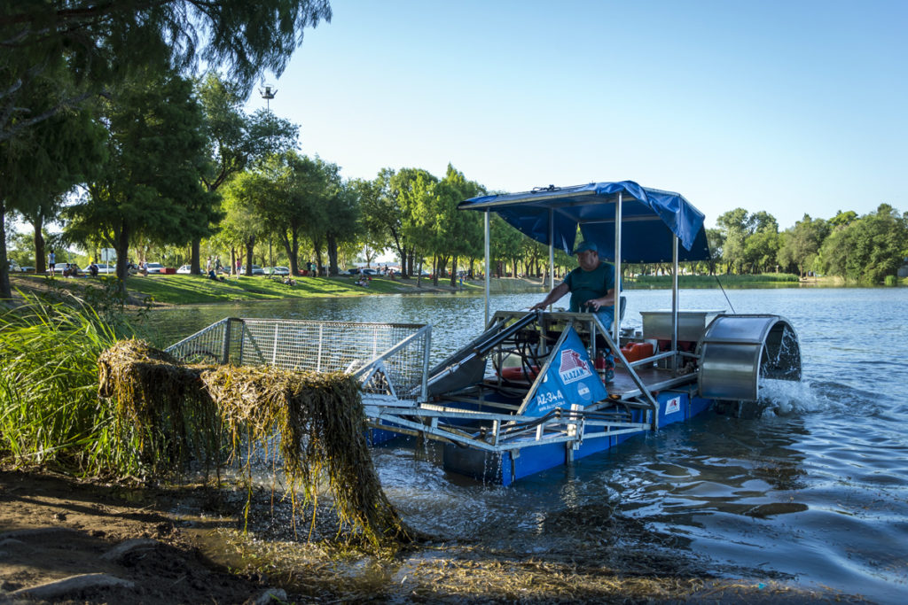 El Intendente Juan Manuel Llamosas recorrió el Lago Villa Dalcar, donde recientemente se puso en funcionamiento una maquina cosechadora de algas para continuar el saneamiento del espejo de agua.