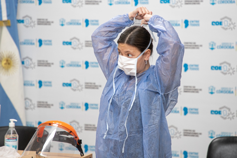 La capacitación estuvo a cargo de Sabrina Penco, infectóloga del Hospital Rawson; quien detalló el paso a paso de cómo colocarse y cómo retirarse correctamente el Equipo de Protección Personal (EPP), necesario para la revisión y toma de muestras de pacientes con sospecha de coronavirus. Este equipo incluye bata, guantes, cofia, gafas y escafandra.