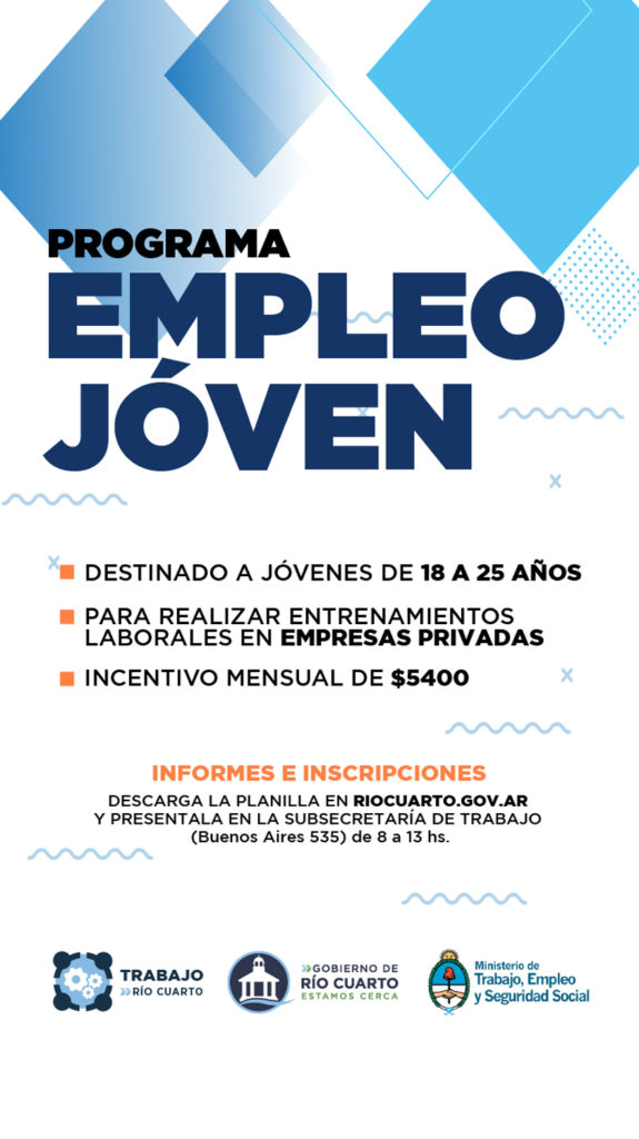 Se reabrieron las inscripciones del Programa de Empleo Joven, dependiente del Ministerio de trabajo de la Nación, y ejecutado por la Subsecretaría de Trabajo del Gobierno de Río Cuarto.