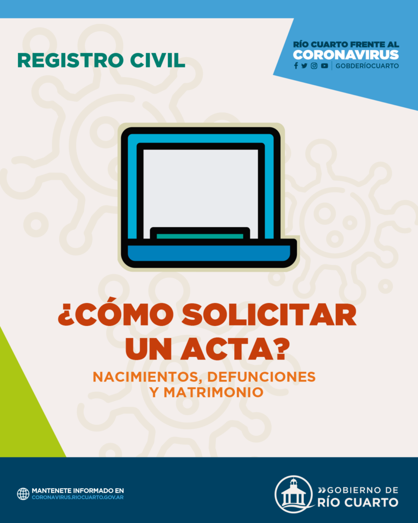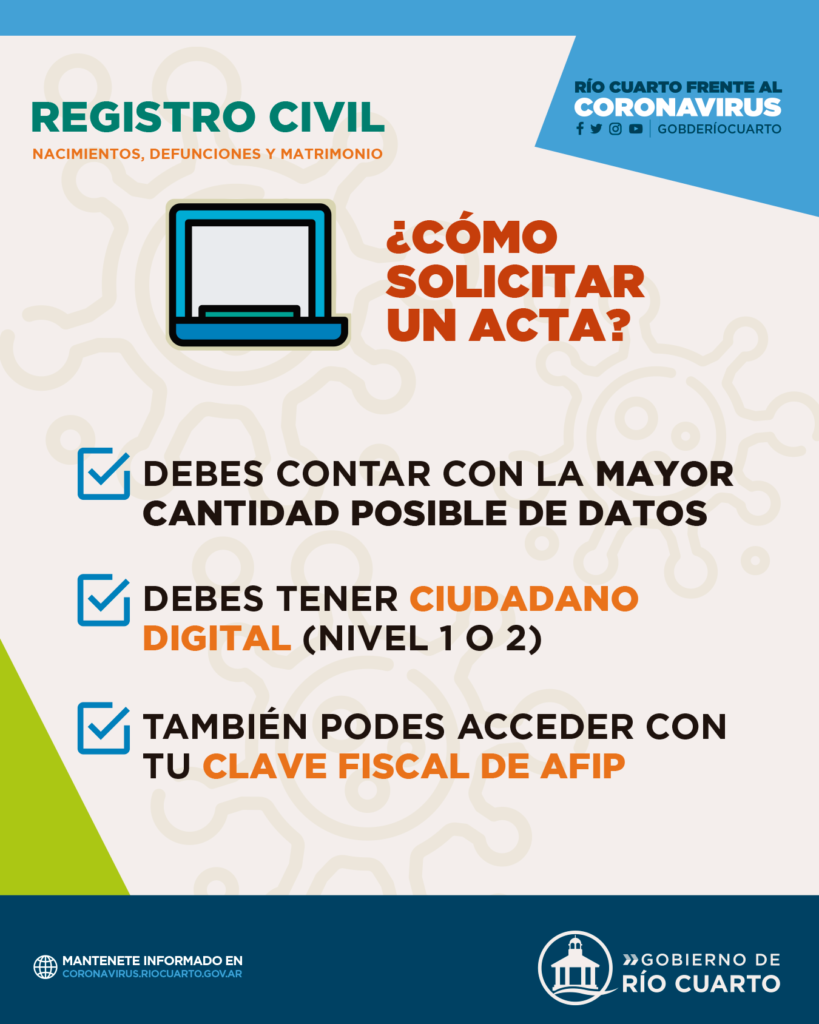 La Dirección del Registro Civil informa que las actas de nacimiento, defunción y matrimonio se pueden solicitar por internet ingresando a la web cidi.cba.gov.ar/portal-publico/. Desde “servicios” se debe acceder al acta correspondiente en el link “Registro Civil Online”. Para ello, se debe contar con Ciudadano Digital (nivel 1 o 2), o bien acceder con la Clave Fiscal de AFIP. Se recomienda tener la mayor cantidad posible de datos al momento de realizar el trámite.
