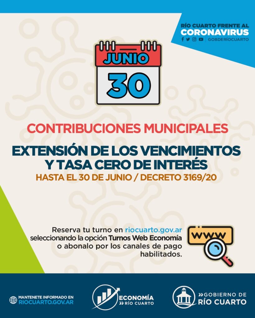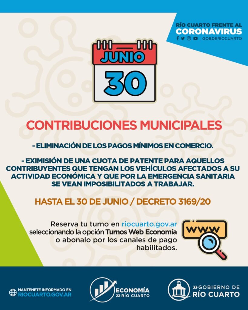 La Secretaría de Economía del Gobierno de Rio Cuarto prorrogó hasta el 30 de junio los beneficios anunciados en el marco del aislamiento social y obligatorio que rige en todo el país.