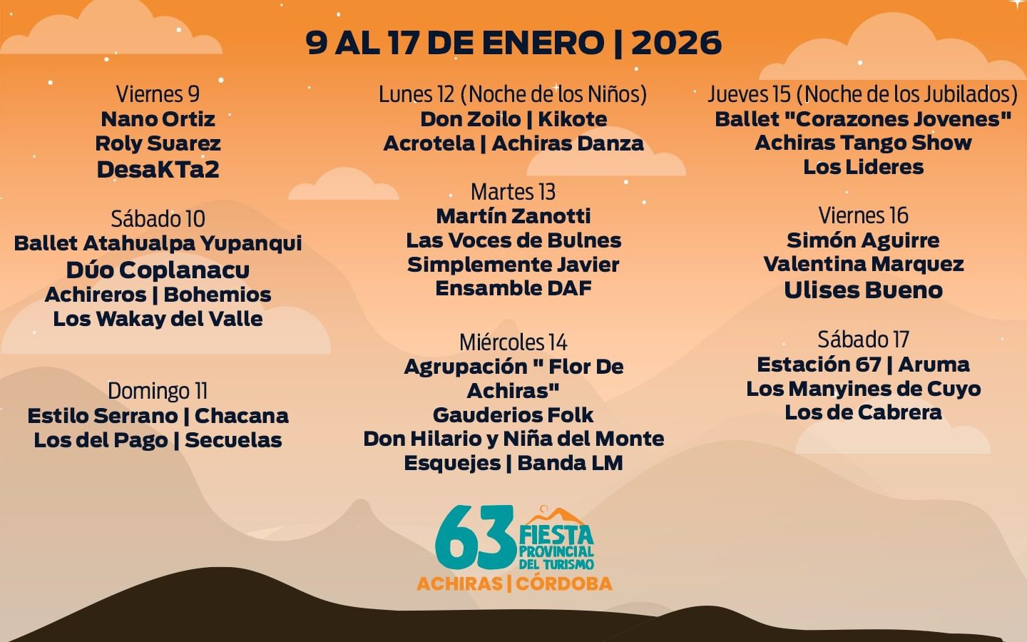 El evento forma parte de la grilla de festivales provinciales del corredor de las Sierras del Sur y contará con las destacadas actuaciones de artistas como DesaKTa2, Simón Aguirre, Valentina Márquez y Ulises Bueno. Además, como en anteriores ediciones, habrá paseo de artesanos y destacada variedad gastronómica.