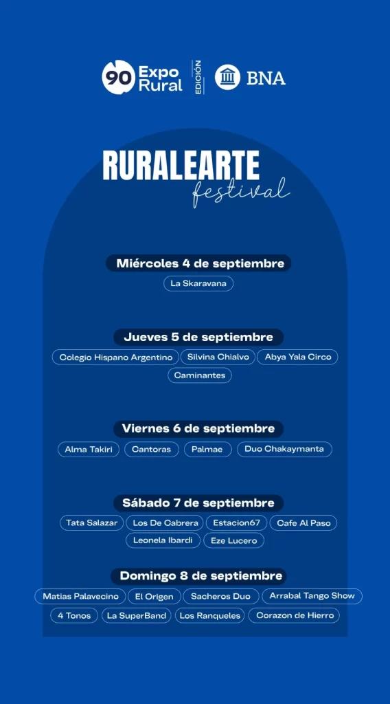 Las puertas de la 90° Exposición Rural de Río Cuarto se abrirán el próximo miércoles 4 de septiembre y hasta el domingo 8. Durante esos días el predio permanecerá abierto de 09.00 a 20.00 con más de 1.000 expositores, entre los que se destacan artesanos, exposiciones ganaderas, agroindustriales, mercado regional, patio gastronómicos y shows.