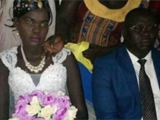 La menor, Nyalong, pasó a ser la novena esposa del hombre. Las fotos en Facebook la muestran sentada junto al novio con un vestido lujoso y mirando al piso con aire abatido.
